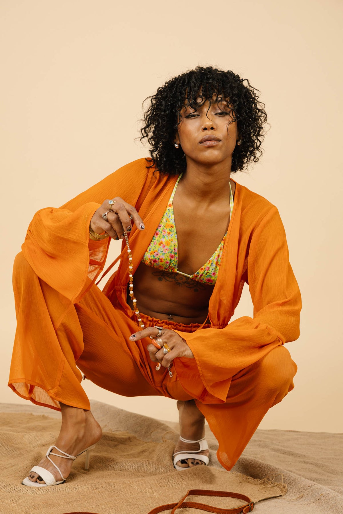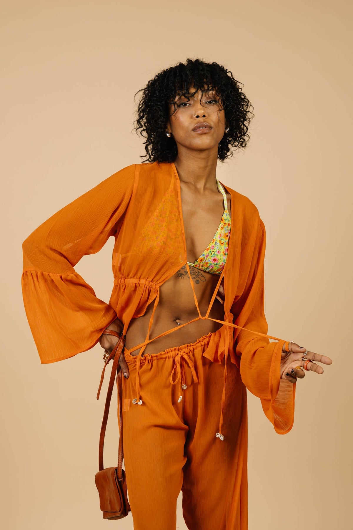 Your wardrobe is about to change with this delicate sheer printed chiffon top, designed to bring a touch of elegance and coastal charm to any outfit. Featuring billowy sleeves and a dreamy green print, this piece effortlessly blends sophistication with a relaxed, bohemian vibe. The top ties gracefully at the front, allowing for a customizable fit, while the handsewn shells at the ends add a subtle yet stunning detail, evoking the serene beauty of the ocean. Perfect for layering or wearing on its own, this top is a versatile must-have for any gal.